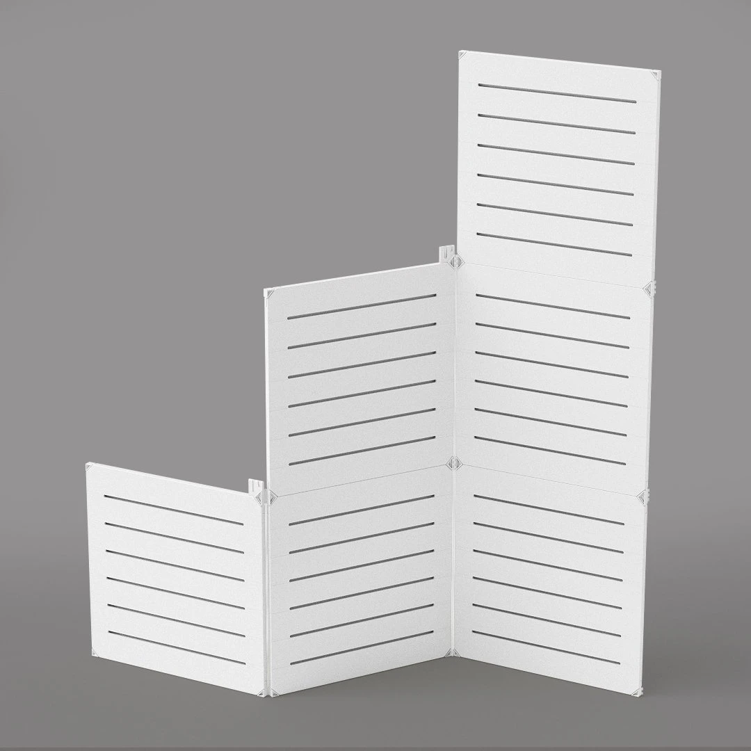 Each panel in this kit is 24″ X 24″(60cmX60cm exact) and weighs 4.8lbs. The panels have 6 slats on one side and are solid on the opposite side. The panels can all be installed with either the slatwall side or solid side facing out in thousands of different configurations.