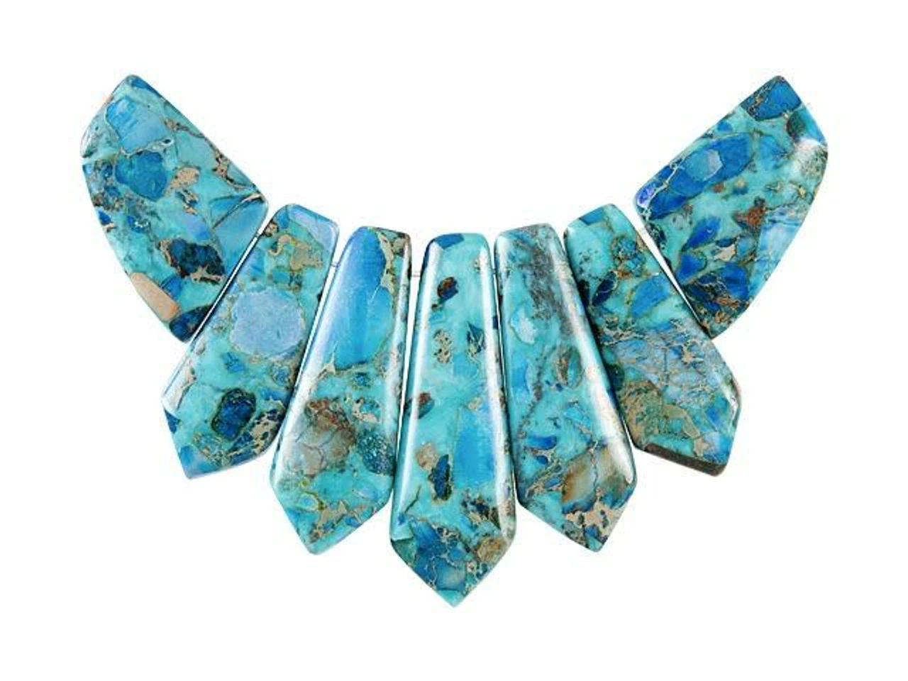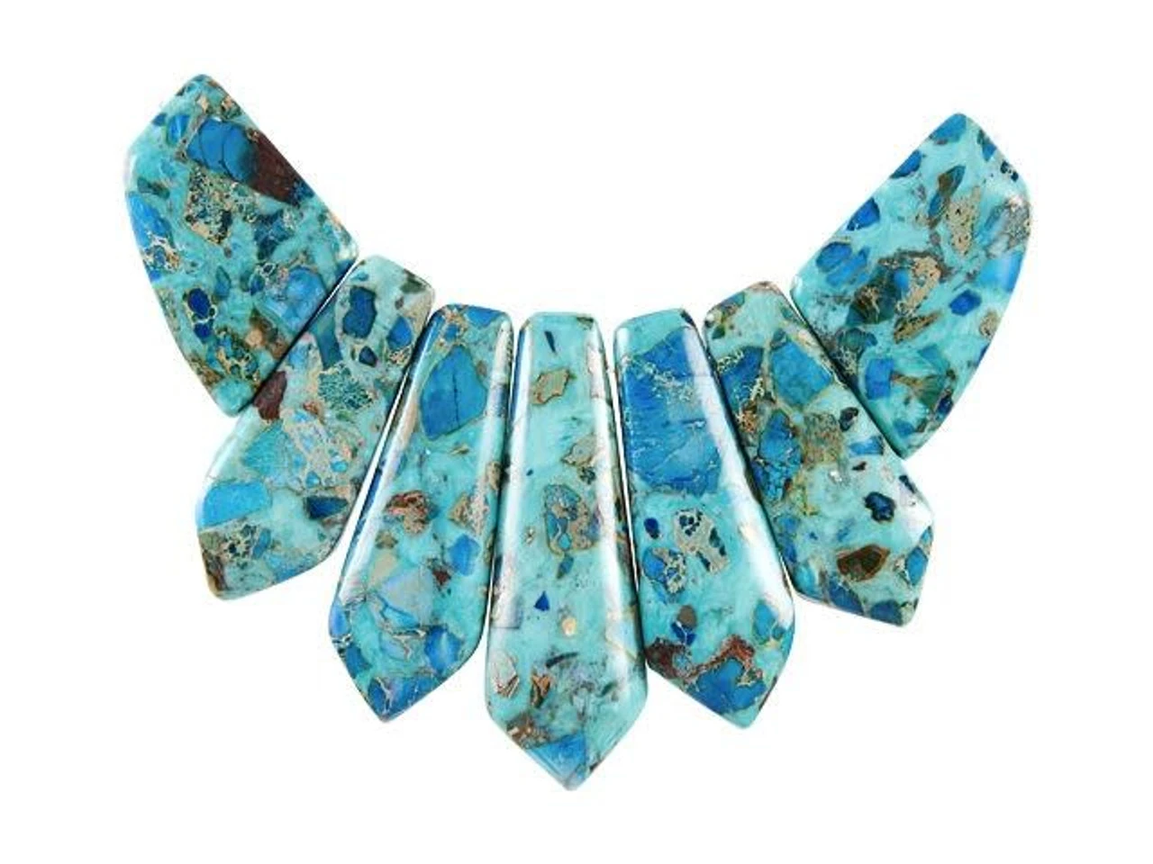 For truly eye-catching style, try this Dakota Stones pendant set. This pendant set includes seven bold and pointed gemstone drop beads in graduated sizes you can easily use in stringing projects. Slide them all together in designs or use them separately. They would even make beautiful elements in bead embroidery. These beads combine blue Impression Jasper and turquoise, for a vibrant look filled with swirling blue colors and a stony matrix. Please note that these beads are made from composite gemstones.