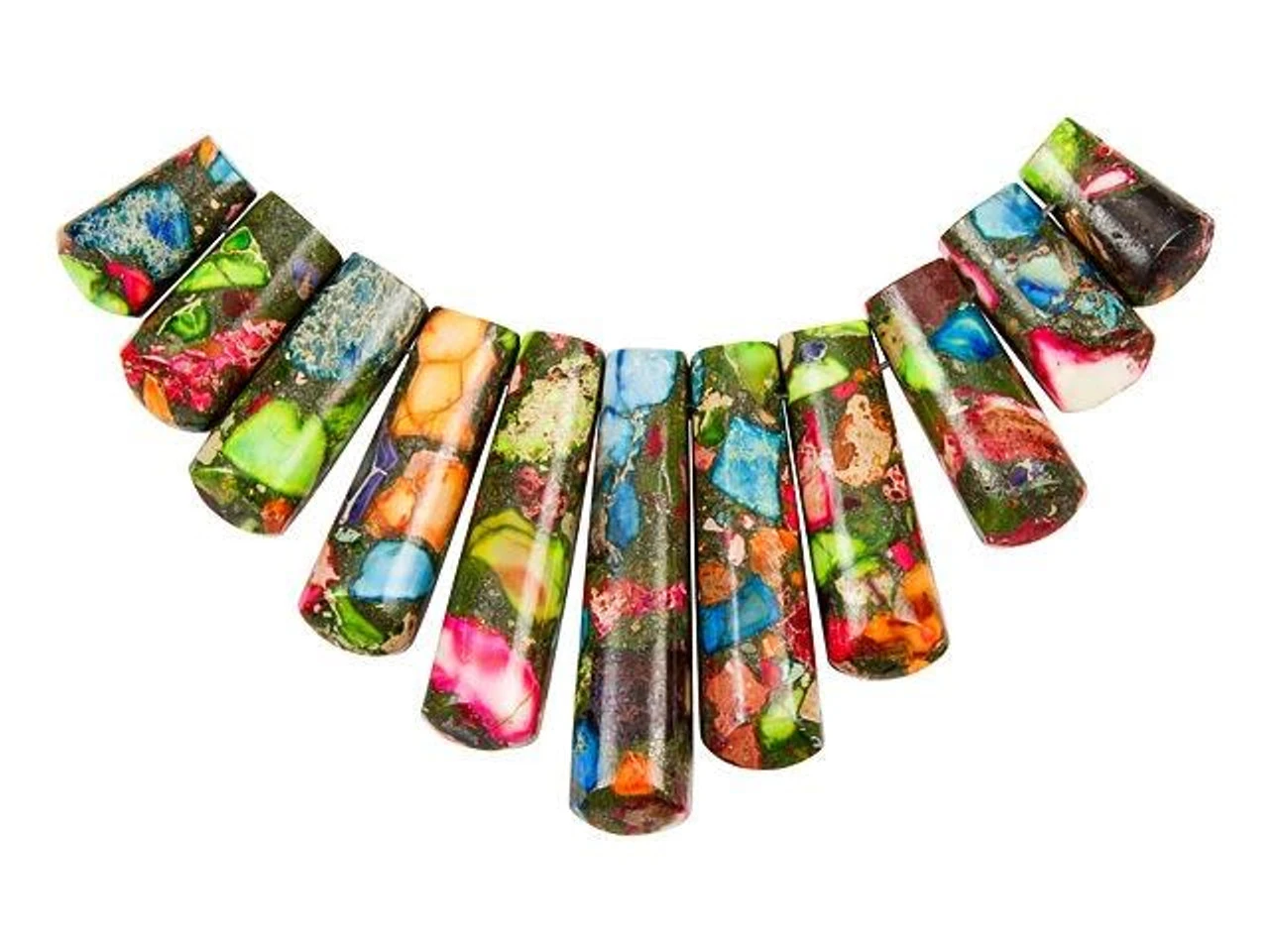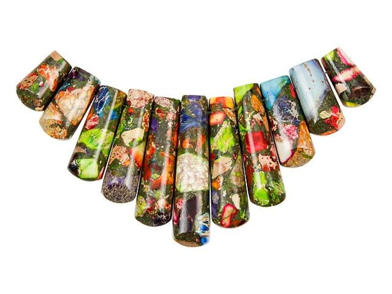 Stand out with a colorful showcase using this pendant set from Dakota Stones. This bead strand features 11 column-shaped beads in graduated sizes, creating a fan look. You can use these gemstone beads together or mix them into different pieces for fun jewelry sets. Impression Jasper comes in a variety of colors. The material features a variety of tan and crimson matrix colors which create a striking contrast to any color it may be enhanced with. These beads feature a medley of green, pink, orange, blue, and brown colors. Metaphysical Properties: Impression Jasper is used to find clarity and inner peace.