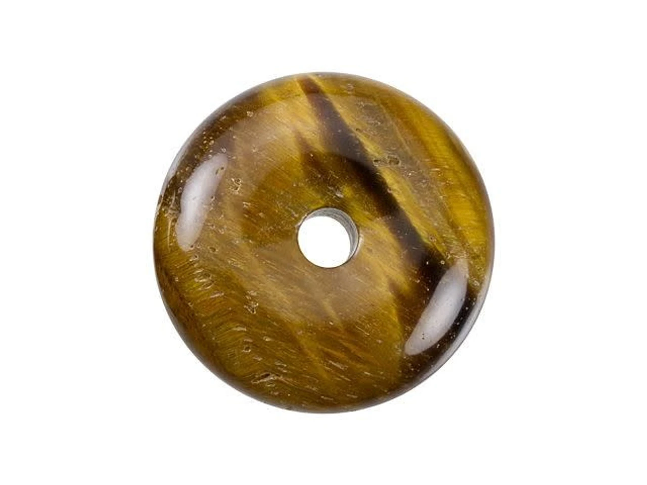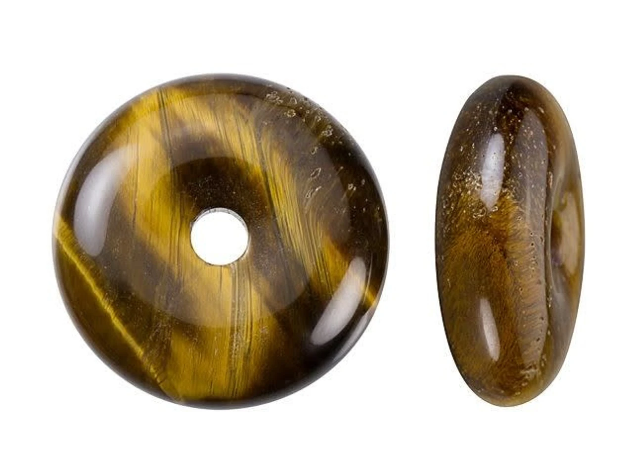 A magical look can be yours with this gemstone pendant from Dakota Stones. This tiger eye pendant features a round donut shape with a hole at the center. You can create your own unique bail for this pendant or simply slide a silk ribbon right through. There are lots of fun ways you can showcase this piece in your designs. This pendant features a golden brown color with a magical chatoyancy that reflects bands of light. Metaphysical Properties: Tiger eye can be used to balance pessimistic behavior and it dissolves negative energy and thought patterns. It has also been used to enhance wealth and vitality.
