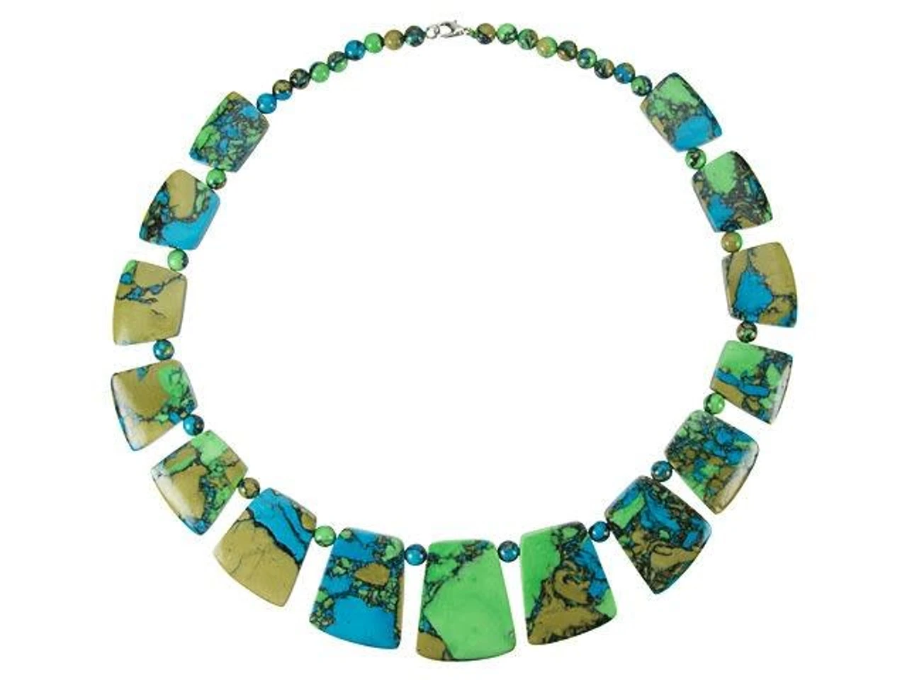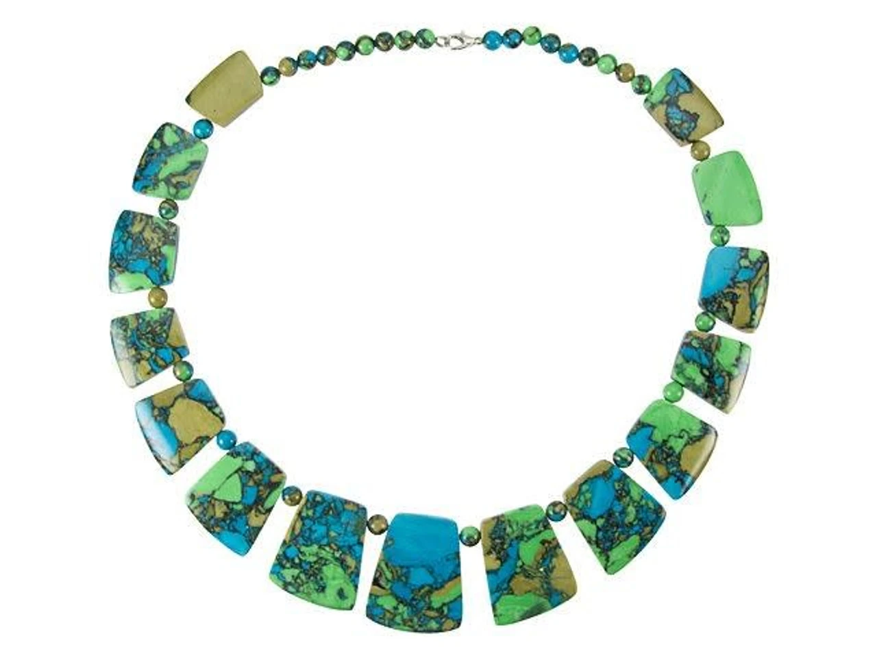 Get creative in your style with this necklace from Dakota Stones. This finished necklaces features tri-colored turquoise beads. Some of the beads are small rounds, while a graduated collar set takes center stage. You can wear this necklace as it is, or cut the strand and use the beads however you want. You’ll love the mix of green, blue and mossy brown colors.