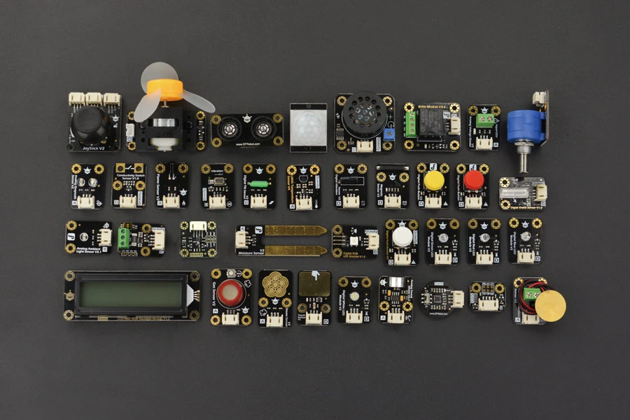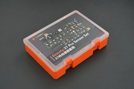 In the version of this sensor kit, we add more sensor modules like, color sensor, digital wattmeter, heart rate monitor sensor, conductivity sensor switch, and digital shake sensor. Besides that, there are RGB LED module, speaker, vibration motor module, DC motor module and RGB backlight display to help you build up your interactive projects.