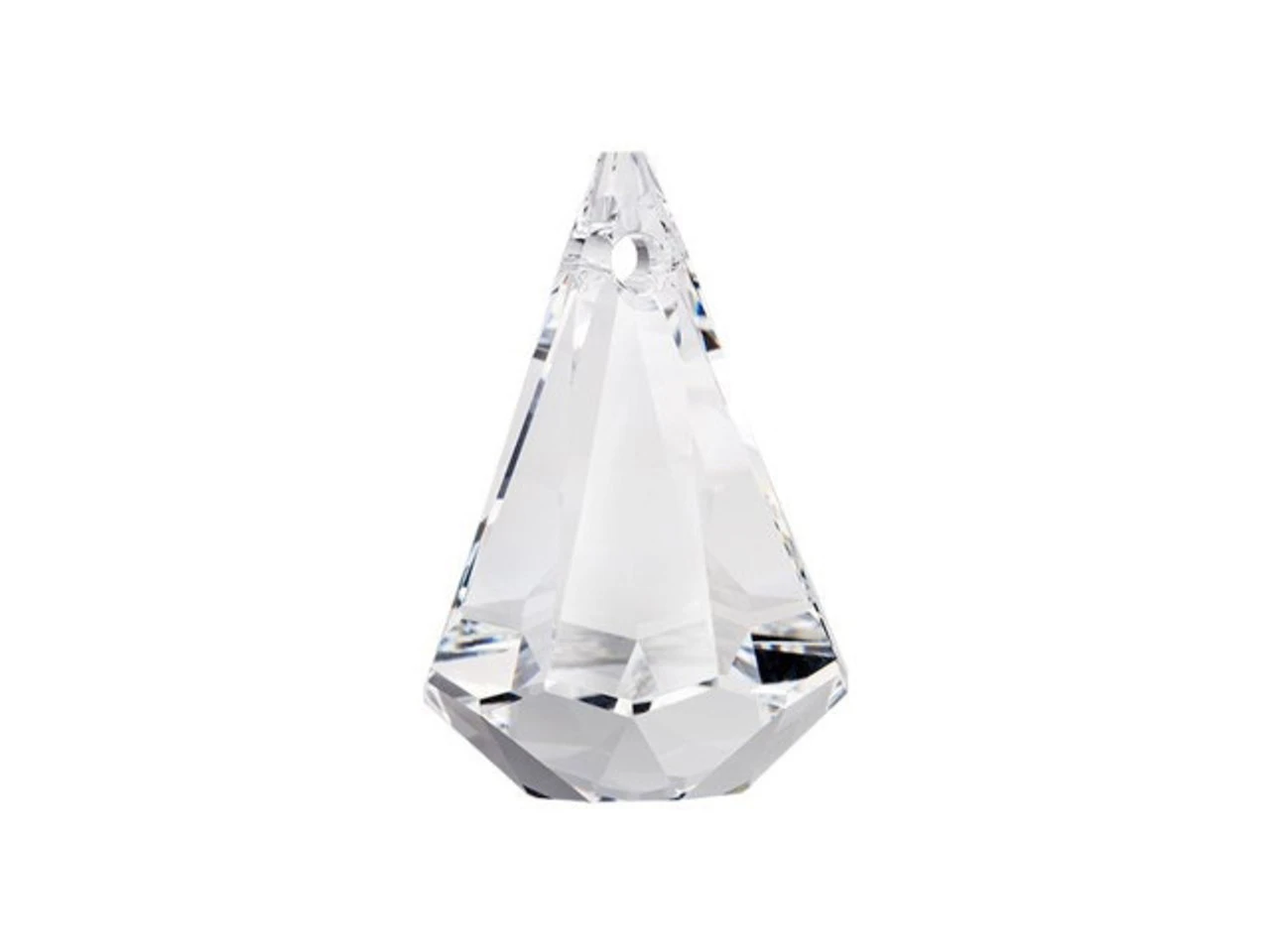 Display a drop of classic sparkle in your designs with the PRESTIGE Crystal Components 6022 33mm raindrop pendant in Crystal. The raindrop pendant is a Chaton-cut drop pendant, full of futuristic elegance. When viewed from below, colorful effects applied from the top of the pendant add a kaleidoscopic beauty. The conical droplet shape is exciting and architectural, a perfect example of fresh style melting with traditional looks. This pendant features a large size and a clear color.