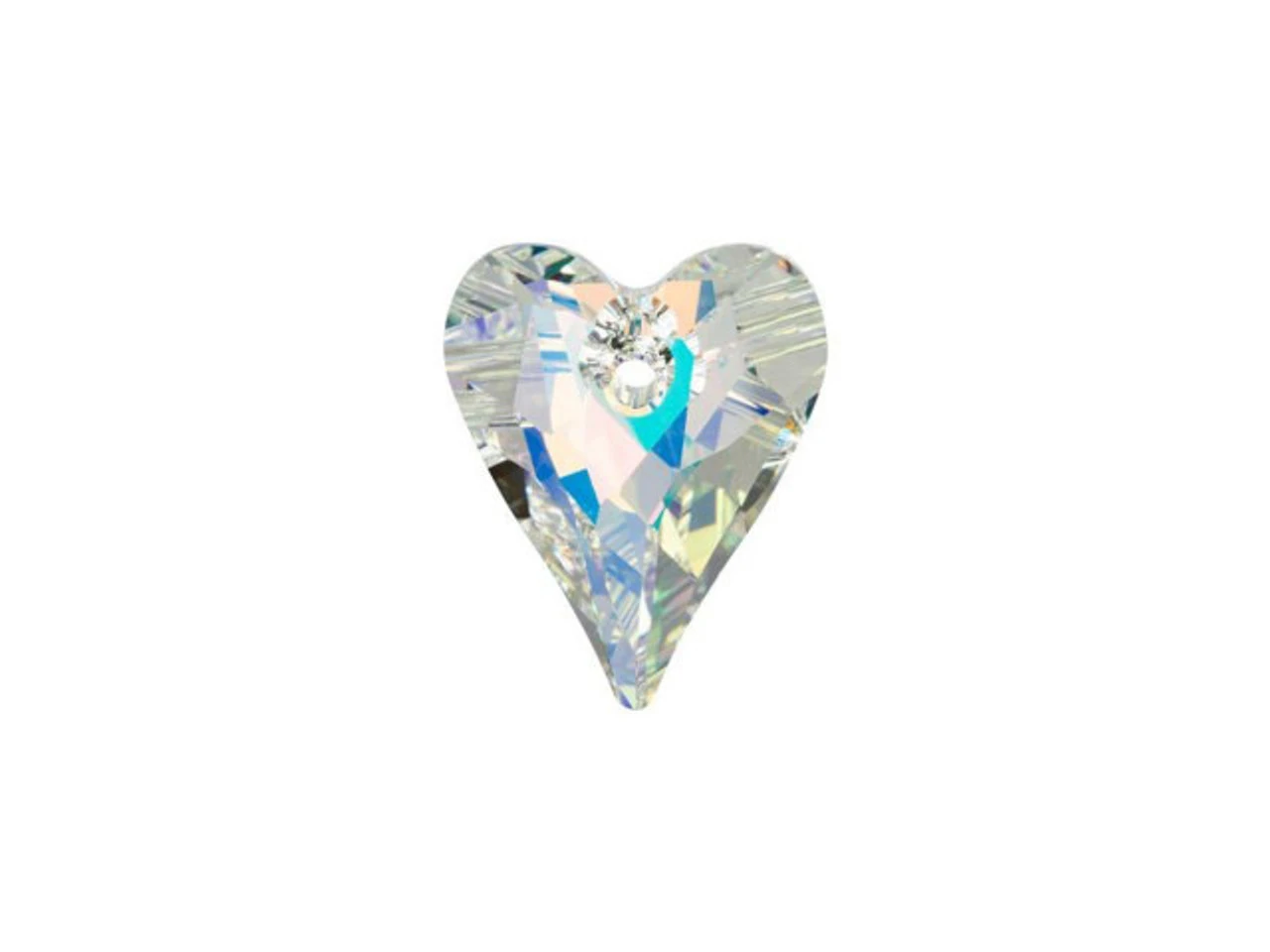 A loving shape shimmers with ethereal color in this PRESTIGE Crystal Components Wild Heart pendant. The irregular facets and elongated point give this heart-shaped pendant a contemporary twist that is sure to spice up your designs. The stringing hole is punched through the top of the shape to provide a lovely dangling effect when strung. These pendants will add a romantic touch to your jewelry designs that feels fresh and new. This pendant features a translucent color coated with iridescence that shimmers with tones of purple, blue, green and yellow.