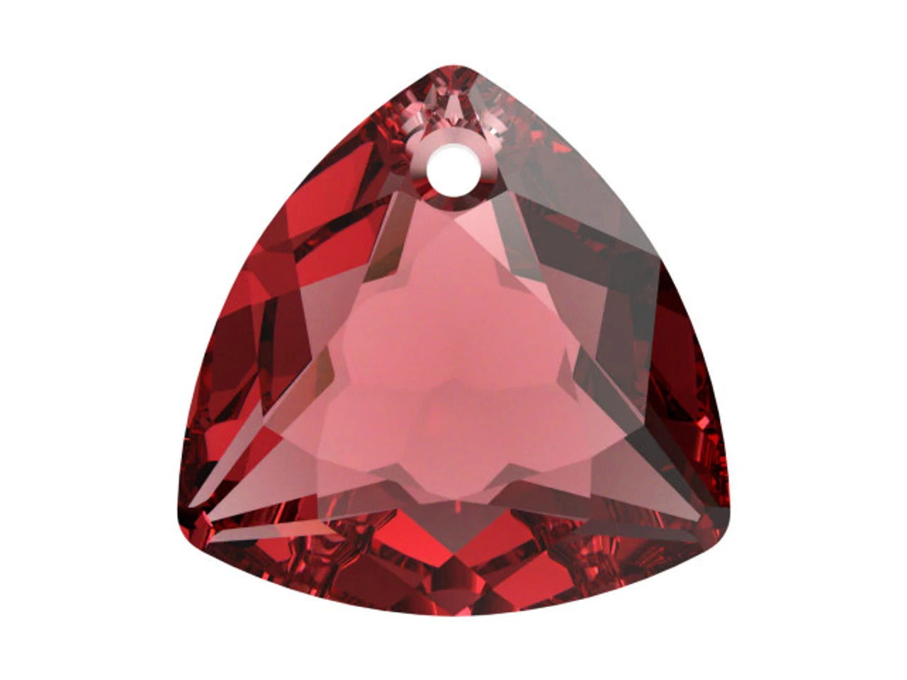 Make your designs shine with this PRESTIGE 6434 Trilliant Cut Pendant in Scarlet. This pendant features a rounded triangle shape with brilliant facets that accent the design. The front features a flat center while the back has rounded point design. There is a stringing hole at the top, so it is easy to add this pendant to your designs.