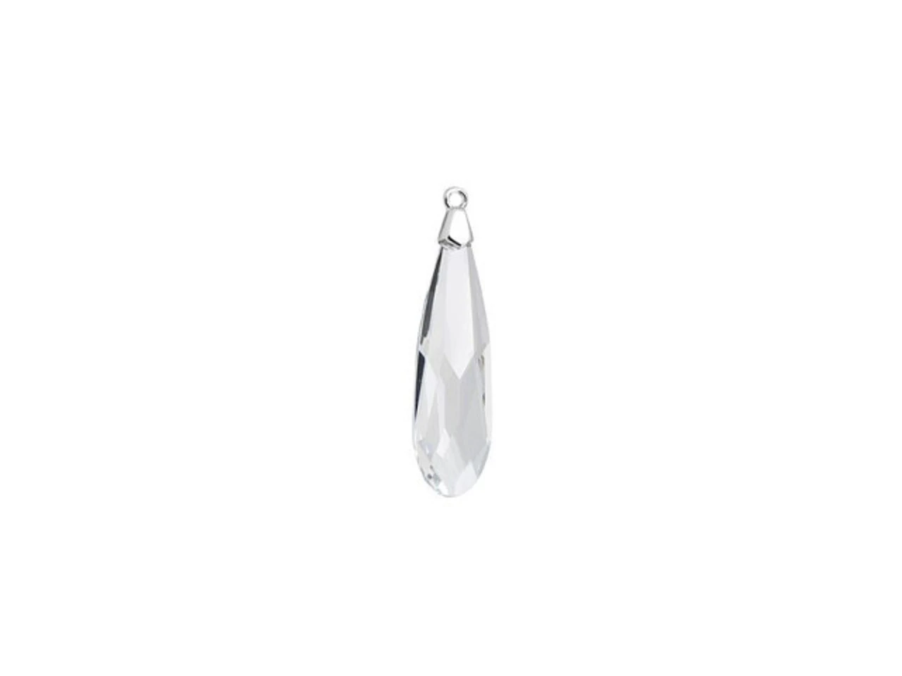 Bring sophisticated style to designs with the PRESTIGE Crystal Components 6533 23mm raindrop pendant with rhodium-plated bail in Crystal. This classic, streamlined cut of a raindrop is sleek, modern and full of clarity. The beautifully elongated silhouette boasts slim geometry and a multilayer cut that creates a playful sparkle. The intelligent metal hanging at the top guarantees easy application. It features a versatile clear sparkle. The bail is silver in color. It features an eye-catching size.